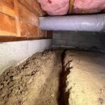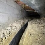 Excavation and installation of a black, 3″ corrugated pipe with a sleeve, surrounded by 3/4″ rock within the crawl space. This system was designed to capture water and direct it towards sump pumps for discharge, preventing water from pooling.