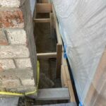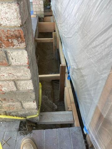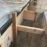 Reconstruction: The new foundation was designed to match the dimensions of the existing foundation, assuming a 12″ wide x 8″ tall footing and an 8″ wide x 18″ tall stem wall. The process included: