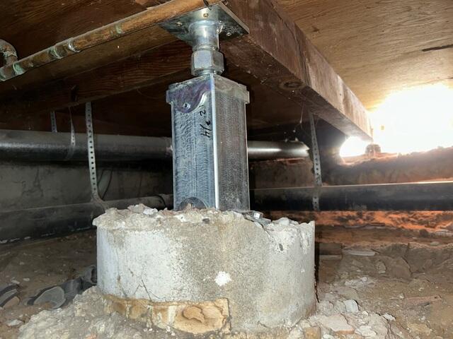 To address sagging within the floor system itself, SmartJack assemblies were installed at strategic points. These adjustable steel supports are designed to stabilize floor joists and beams, adding further stability to the floor structure. Although floor leveling is not guaranteed, SmartJacks provided significant reinforcement to prevent additional sagging. - Concrete Removal and Replacement: