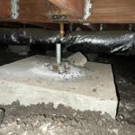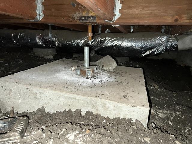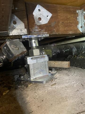 To solve this issue, our crew replaced 7 of the disconnected steel support posts with brand new SmartJack Adjustable Steel Posts. Then they installed 4 Concentric piers to lift and stabilize a spread footing within the crawl space to further support the floor. To top it off, they installed 3 Push Piers to lift and stabilize the garage wall that was sinking, and 1 Helical Push Pier to lift and stabilize the portion of the front entranceway that was lighter in weight.