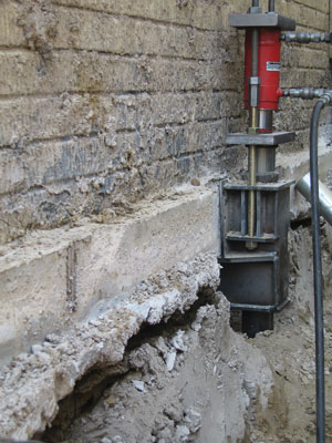 The Foundation Supportworks Push Pier System utilizes high-strength round steel tubes and a load transfer bracket (retrofit Foundation repair bracket) to stabilize and/or lift sinking or settling foundations. The foundation bracket is secured against the existing footing and pier sections are driven hydraulically through the foundation bracket and into the soil below using the combined structural weight and any contributory soil load as resistance. Pier sections are continuously driven until a suitable load-bearing stratum is encountered. At that point, the structure either begins to lift or the target pressure/load is achieved. The weight of the structure is then transferred from the unstable soil to the foundation brackets, through the piers, and to firm load-bearing soil or bedrock.
