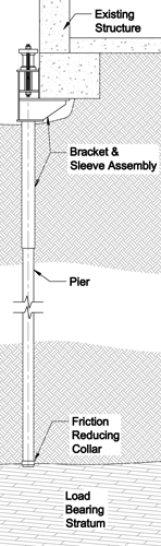 Push piers are installed directly adjacent to the existing structure utilizing side-load brackets. This introduces eccentricity into the system. The Model 288 Push Pier System incorporates an external sleeve at the top of the pier to aid in resisting the bending forces generated by this loading condition. This helps preserve the axial compressive capacity of the pier shaft. The external sleeve extends through and below the foundation bracket to essentially create a bracket that is 48 inches tall.