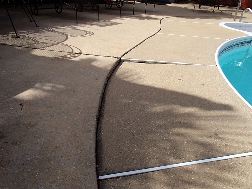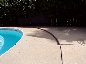 Before photo of sinking concrete pool deck Sinking pool deck repaired with PolyLevel® concrete lifting