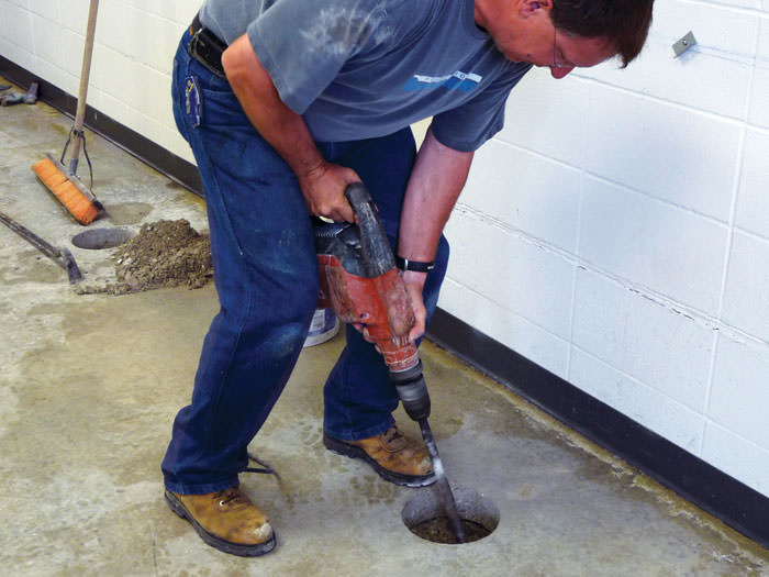 At the beginning of each slab pier installation, a small hole is cored through your concrete slab floor. This hole will create an access point for the slab piers that are about to be installed.