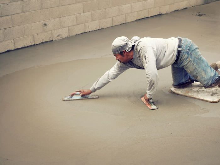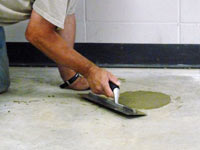 A contractor smoothing out a surface of releveling grout during a concrete slab repair. The previous concrete floor had shown cracks during settlement.
