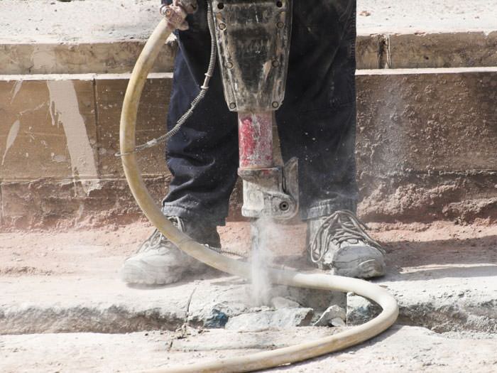 A concrete slab being jackhammered and removed during a floor replacement in Tracy. A typical replacement can take several weeks to complete.