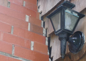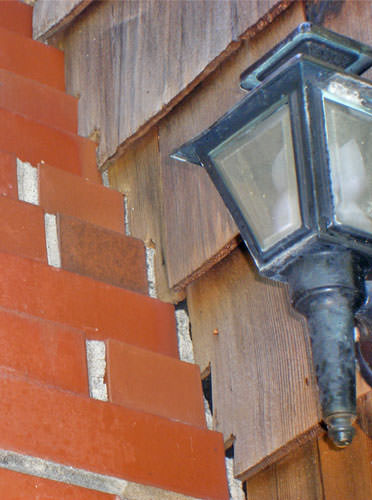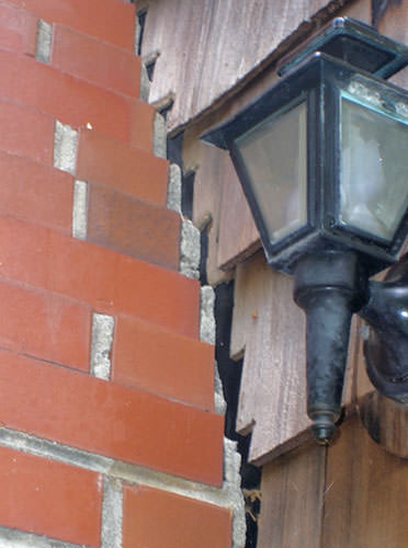 (Top) A chimney is tilting away from the home foundation by about 1".