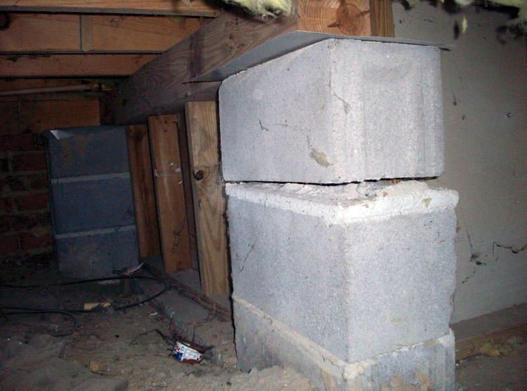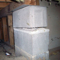 During installation, we prepare a base of compacted engineered fill at all jack placement points, located directly beneath the main support beam. We install a pre-cast concrete base on this fill, and then extend a crawl space jack between the base and the beam.