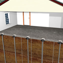 Slab floors that are sinking independently of the walls can be repaired with a slab pier system, shown on the right. These piers are placed in cored holes in the floor, extending down to competent soils to hold your floor in place. They can even be used to lift a slab back to its original, level position.