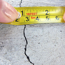 Shrinkage cracks tend to be very small "hairline" cracks that are usually 1/16" wide or less. They generally occur near the center of a span and maintain a consistent width for the length of the crack.